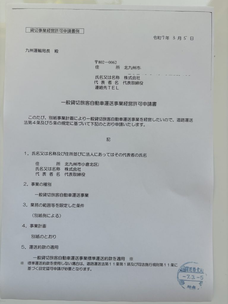 令和7年3月5日、福岡運輸支局にて貸切バス申請(一般貸切旅客自動車運送事業経営許可申請)が受理されました。